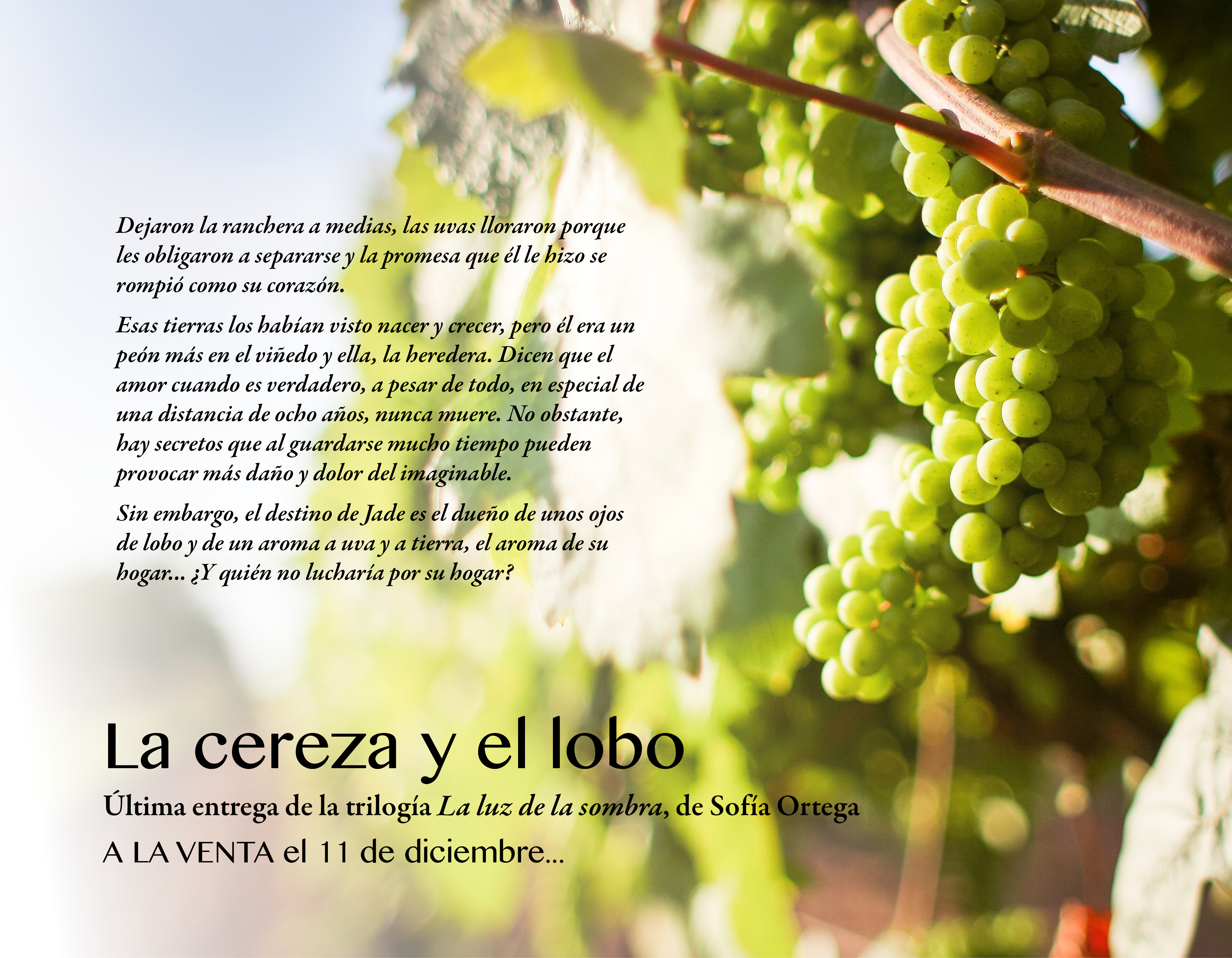 ¡¡Ya hay fecha de publicación de la tercera novela de mi trilogía La luz de la sombra!! El próximo 11 de diciembre saldrá a la venta en papel La cereza y el lobo en Amazon. Para el ebook y Kindle Unlimited, la fecha será el jueves 21 de diciembre. El regalo perfecto para Navidad, ¿verdad? ¡Qué emoción!